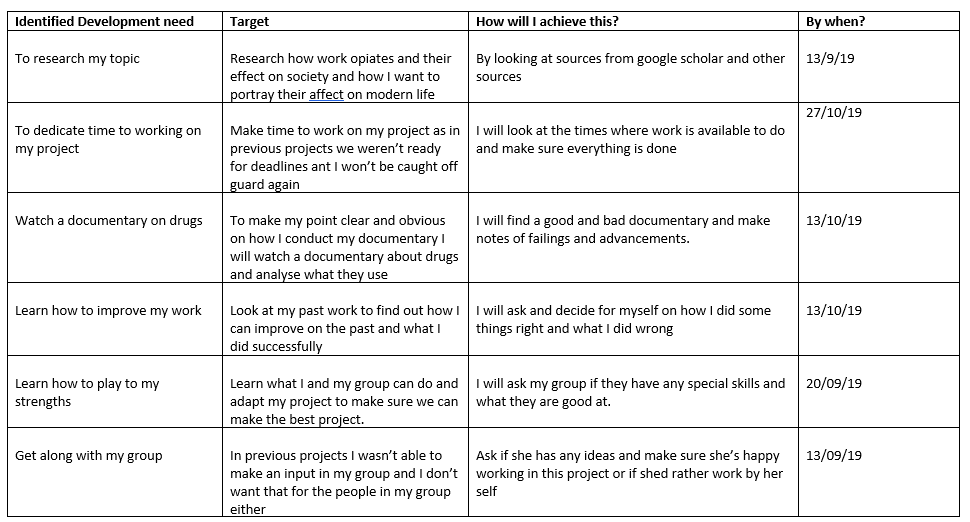 Having conducted a swot analysis I have found my strengths are that I have many opportunities that I can take advantage of while I still have time and I am able to research topics with relative success. This means that my research won’t take long and I am able to